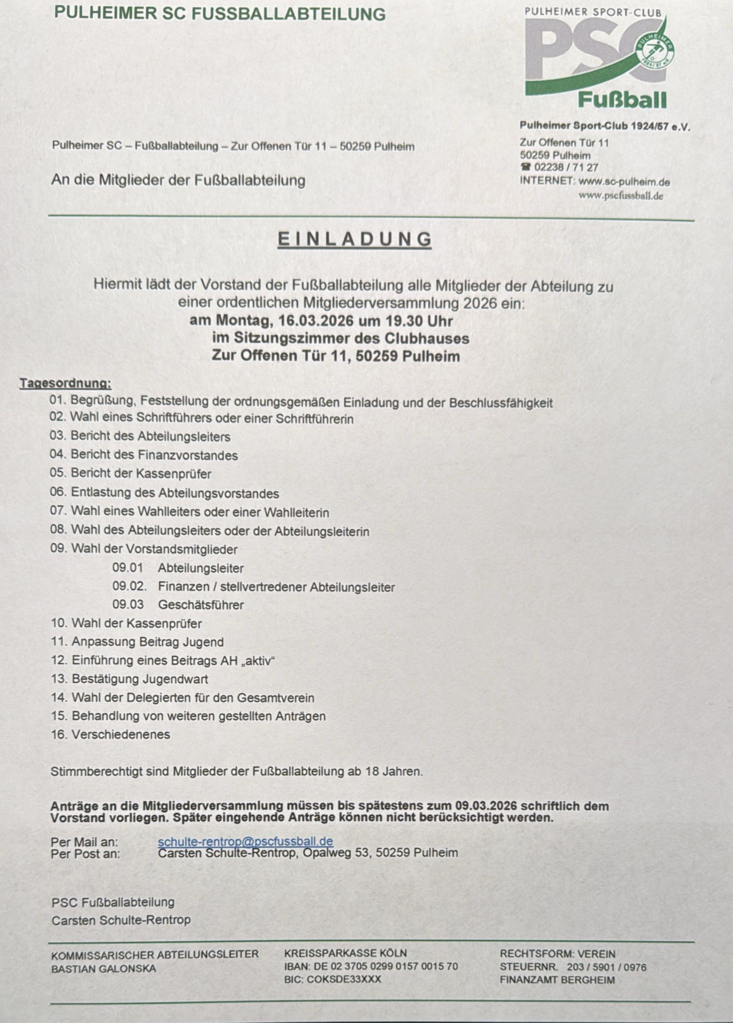 Am Montag, dem 16.03.2026, findet unsere ordentliche Mitgliederversammlung 2026 im Sitzungszimmer des Clubhauses statt. Weitere Informationen findet Ihr in der offiziellen Einladung.